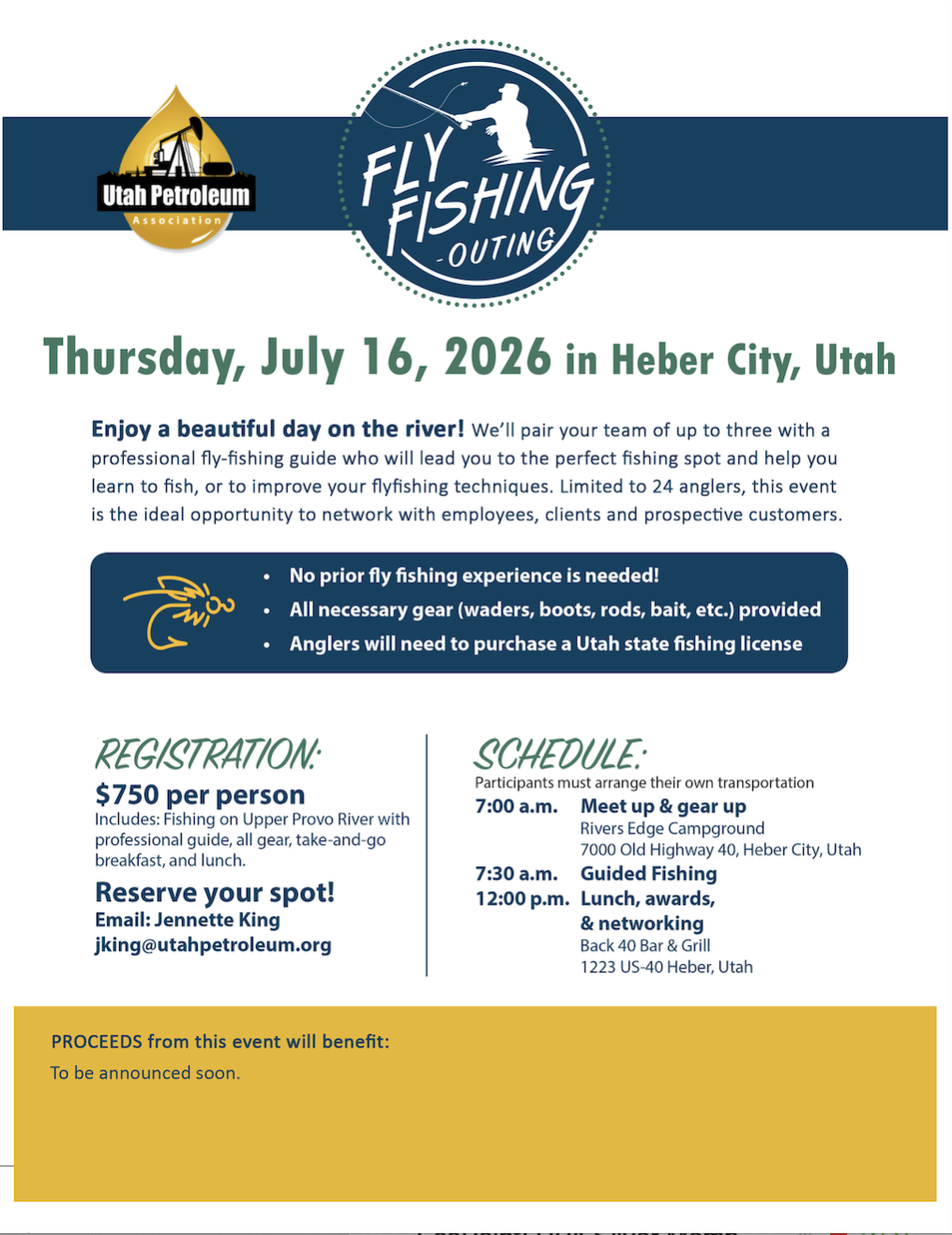 Enjoy a beautiful day on the river! We’ll pair you or your team of up to three with a professional fly-fishing guide who will lead you to the perfect fishing spot and help you learn to fish, or to improve your fly fishing techniques. Limited to 24 anglers, this event is the ideal opportunity to network with employees, clients, and prospective customers. Charity recipient for 2026 to be announced soon. Meet at River's Edge Campground to gear up, eat a light breakfast. Anglers will meet with their team and guide, then proceed to an open spot along the Upper Provo River. 7:00 a.m. Meet up & gear up